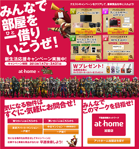 不動産情報サービスのアットホームは、1月7日、カプコンの人気ゲームソフト『モンスターハンター』とタイアップし、「みんなで部屋を一(ひと)借りいこうぜ!」を合い言葉に、新生活応援キャンペーンを開始した。3月31日まで。