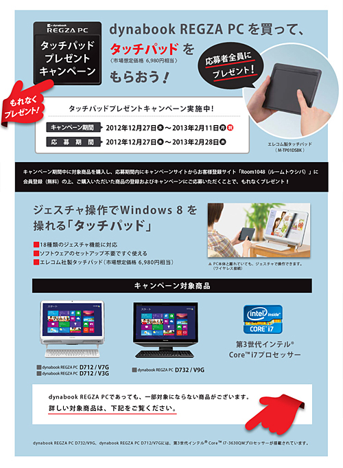 2012年12月27日から2013年2月11日までのキャンペーン期間中に、「D712/V7G」「D712/V3G」「D732/V9G」など、「dynabook REGZA PC」の対象商品を購入し、2月28日までの申込み期間内に応募したユーザー全員に、もれなくエレコム製のワイヤレスタッチパッド(ブラック)をプレゼントする。