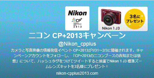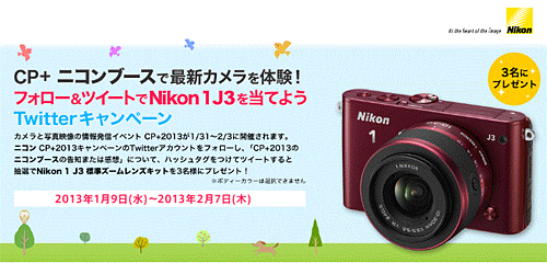 ニコン CP+2013キャンペーンTwitterアカウント(@Nikon_cpplus)をフォローし、CP+2013のニコンブースの告知やブースで実際に最新カメラを触った感想などにハッシュタグをつけてツイートすると、抽選で3名にミラーレス一眼カメラ「Nikon 1 J3 標準ズームレンズキット」をプレゼントする。キャンペーン期間は1月9日から2月7日まで。