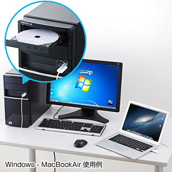 ウルトラブックやMacBook Pro、MacBook Air、Windows搭載のタブレット端末などの光学ドライブを搭載していないPCと光学ドライブ搭載のPCをケーブルで接続するだけで、2台のPC間で光学ドライブが共有できる。
