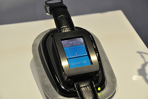 国内メーカーでは、東芝が有機ELディスプレイを搭載した腕時計型のデバイス「Computer Graphic Watch」を参考展示。心電計や加速度センサなどを内蔵し、心拍数や活動量の計測機能を備える。また、スマートフォンと連携して、メール受信や電話の着信を知らせてくれる。ブースでは残念ながら動作する製品には触れなかったが、早い時期の製品化を検討しているという。