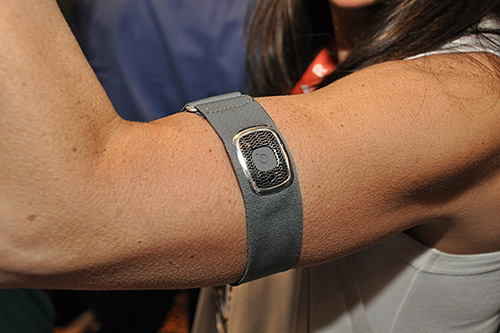 腕に巻きつけるだけで心拍数や動きなどを計測し、Bluetoothで転送・記録するセンサ、米BodyMediaの「Body Media FIT」は、日々の活動量や消費カロリーのほか、眠りの深さや質のチェックができる。こうしたからだに巻きつけて身体情報を計測するバンドや腕時計などの製品が、数多く展示されていた。