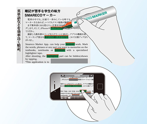 「スマレコマーカー」は、緑とオレンジの2色のラインが特徴のマーカーペン。教科書や参考書などの暗記したい箇所をマーキングして専用アプリ「smareco MARKER App」で撮影すると、その部分を表示/非表示が切り替えられるデジタル暗記帳ができる。切り替えは、自動送りボタンを使って片手で操作可能。