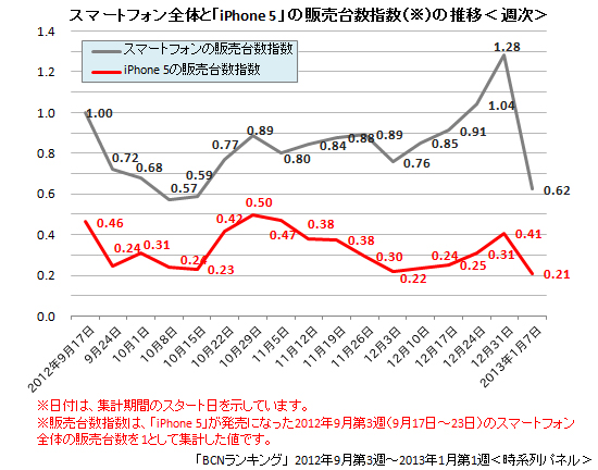 容量の異なる「iPhone 5」をキャリアごとに合算すると、1位はソフトバンクモバイルの「iPhone 5」(15.1%)、2位はauの「iPhone 5」(13.5%)となり、シェア7.4%の「AQUOS PHONE ZETA SH-02E」は実質的には3位になる。2キャリア販売分を合算すると、「iPhone 5」は、2012年9月、10月、11月、そして12月と、4か月連続でトップを獲得。ただし販売台数は11月をピークに減少に転じ、10月・11月には4割近くあったシェアも、12月は22.4%に下がり、3割を切ってしまった。他の機種に比べると販売台数は圧倒的に多いが、早くも次期モデルや廉価版の噂が出ており、買い控えの発生が懸念される。これまでのように、長期間にわたって売れ続けるロングセラーとなるか、先行きはやや不透明だ。