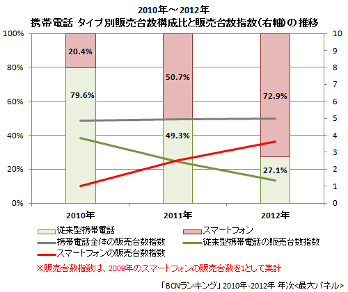 携帯電話全体の2012年の年間販売台数1位は、シェア4.7%でソフトバンクモバイルの「iPhone 4S」の16GBモデルだった。2位はauの「iPhone 4S」の16GBモデル(3.1%)、3位はドコモの「Xperia acro HD SO-03D」(3.0%)で、iPhone 5/4S/4についてキャリアごとに容量を合算すると、ソフトバンクモバイルの「iPhone 4S」、auの「iPhone 4S」、ソフトバンクモバイルの「iPhone 5」、auの「iPhone 5」、ドコモの「Xperia acro HD SO-03D」の順となった。上位20位以内には、「N-03D」など、従来型携帯電話も7機種ランクインしている。また、iPhoneシリーズすべてを合算するとシェアは23.3%となり、ほぼ2割を占めた。もちろんダントツのトップだ。