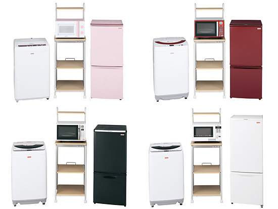 冷蔵庫、洗濯機、電子レンジの3点セットの価格は、ピンクを基調にした「ピンクパック」が7万5800円、プレミアムレッドを基調にした「レッドパック」が8万9800円、ブラックを基調にした「定番ブラックパック」が8万3800円、ホワイトを基調とした「定番ホワイトパック」が9万4800円。製品は単品でも販売する。