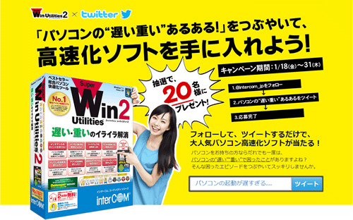 インターコムは、公式Twitterアカウント「@intercom_jp」のフォロワー数が800人を超えたことを記念して、パソコン高速化ソフト「SuperWin Utilities 2」を抽選で20名にプレゼントするTwitterキャンペーンを開始した。1月31日まで。