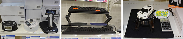 ドスパラ パーツ館の「上海問屋コーナー」は、3階フロアの半分ほどを使って上海問屋の商品を陳列・販売する。取扱い商品は、PC周辺アイテム、スマートフォン/タブレットアクセサリ、カメラ関連製品、カー用品、日用雑貨など、多岐にわたる。