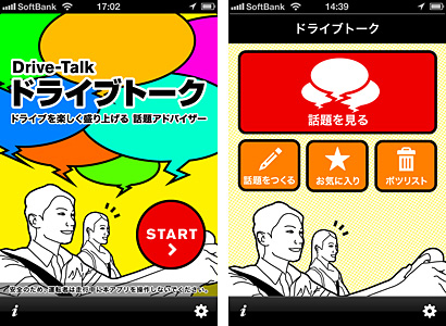 ドライブの場に応じた話題を提供する話題アドバイザーアプリ。昨年公開したAndroid版は、7万ダウンロード以上を記録した。今回、新たに英語版の話題を追加するとともに、iPhone版の提供を開始。初デート、取引先や上司などとのクルマの移動で話題に困ったときや、友だち同士でのドライブでさらに盛り上がりたいとき、また英語で話したいときなど、さまざまな場面で楽しめる。