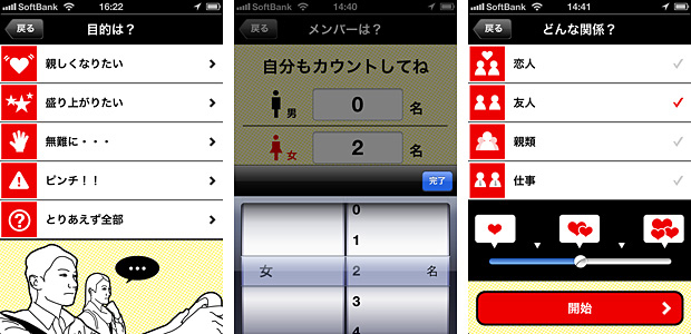 話題を探すときは、最初に「話題を見る」を選んでから、「親しくなりたい」「盛り上がりたい」など、会話の目的を選択。会話をする人数や、恋人・友人・親類などの関係を選び、ハートの数でその親密度を設定して「開始」ボタンを押せば、条件に適した話題を表示する。「次の話題」を押せば、他の話題に移る。