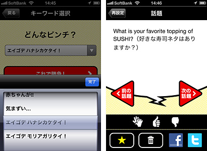 追加した英語版の話題は、「話題を見る」の次に、会話の目的で「ピンチ!」を選び、プルダウンで「エイゴデ ハナシカケタイ!」または「エイゴデ モリアガリタイ!」を選択して「これで勝負!」を押すと表示される。「What is your favorite topping of SUSHI?(好きな寿司ネタはありますか?)」など、英文と日本語訳で表示する話題を複数用意。外国人とのドライブにも対応する。