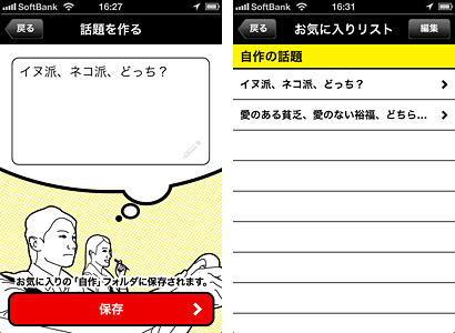 自分で考えた話題も登録できる。入力した話題は「お気に入り」のなかの「自作」フォルダに保存される