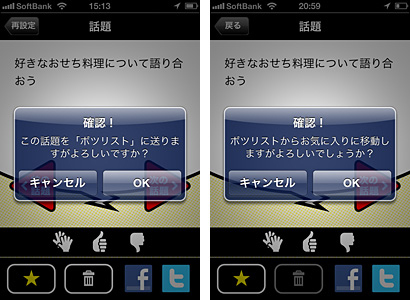 自分で考えた話題を登録することもできる。最初の画面で「話題をつくる」を選んで入力すると、「お気に入り」のなかの「自作」フォルダに保存される。自作したものを含め、自分が不要だと思った話題は、ゴミ箱マークを押して「ボツリスト」に移行したり、逆に★マークを押して「お気に入り」に復活させたりできる。