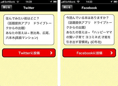 TwitterやFacebookと連動。拡散したり友だちと共有したりできる