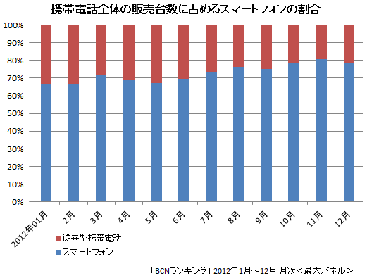 携帯電話市場でのスマートフォンが占める割合は日々大きくなっている。2012年を振り返ろう。ちょうど1年前、2012年1月に販売された携帯電話のなかでスマートフォンが占める割合は66.5%だった。商戦期の3月は71.6%、8月は76.5%と構成比を伸ばし、11月には最高の80.9%をマークした。