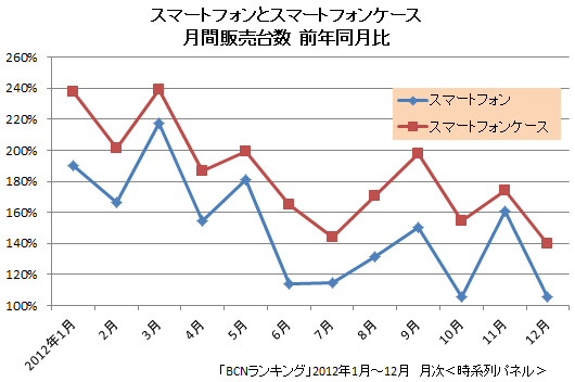 スマートフォンの普及を背景に、スマートフォンケース市場が急速に伸びている。販売数の前年同月比をみると、スマートフォンケースは、本体のスマートフォンを超える伸びを示している。2012年12月だけをみても、スマートフォンが105.8%の微増だったのに対し、スマートフォンケースは139.6%と2ケタ成長だった。