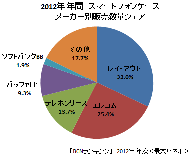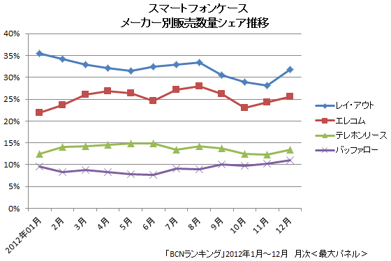 注目したいのが、3位のテレホンリースと4位のバッファローだ。2012年の年間販売台数No.1を表彰する「BCN AWARD 2013」では、ケースだけでなく、保護フィルム、バッテリなどを含めた「スマートフォンアクセサリ」部門をテレホンリースが制した。ケース単独でみると、そのシェアは13%前後で安定して推移している。そこに2012年の夏以降、4位のバッファローがじわじわとシェアを伸ばして迫ってきた。12月の2社の差は、わずか2.4ポイント。この春商戦でバッファローがテレホンリースを抜き、3位に浮上する可能性もありそうだ。