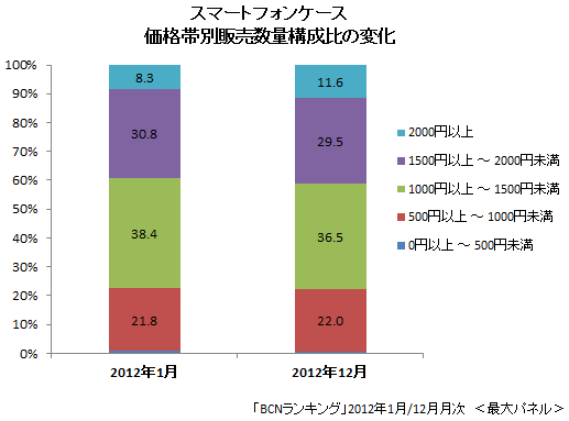 BCNランキングで税別の平均価格帯別シェアをみると、2000円以上の商品のシェアは、2012年1月の8.2%から12月には11.6%に増えている。減少しているのが1500円以上2000円未満の層。1500円未満の層は変化がない。2013年のスマートフォンケース市場は、高価格の「こだわりケース」と、気軽に買える「シンプルケース」の二極化が進むのではないだろうか。(BCN・山下彰子)