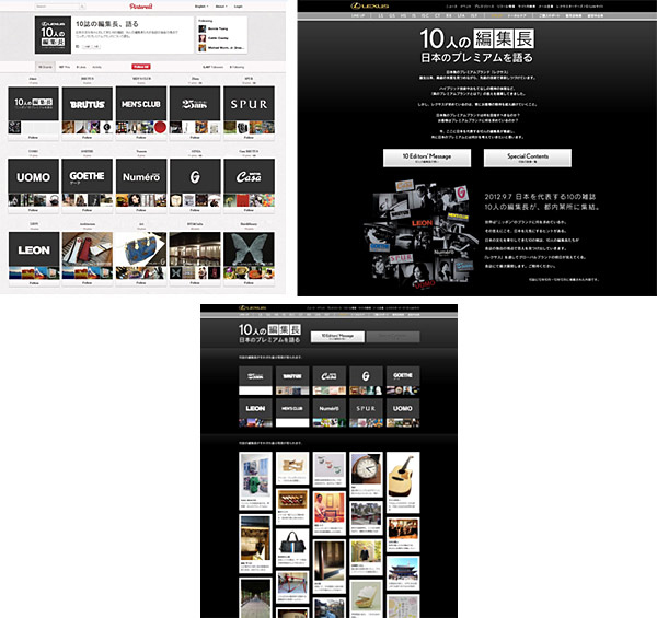 トヨタ自動車は、1月31日、日本を代表する雑誌10誌の編集長が参加する「10人の編集長 日本のプレミアムを語る」プロジェクトを、写真共有型SNS(ソーシャル・ネットワーキング・サービス)の「Pinterest(ピンタレスト)」特設ページと高級車ブランド「LEXUS」公式サイト内の特設ページで開始した。3月31日まで。