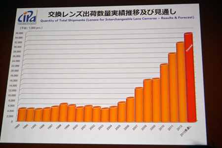 木村眞琴代表理事会長は、2012年の概況を「全体では台数でマイナス、金額はレンズ交換式の伸びがあって若干の微増。2013年は、前年比で1割以上の台数減の見込みだ。カメラや周辺機器の不調は、世界的に低迷する経済環境やモバイル機器のカメラ機能の充実など、さまざまな要因がある。メーカーは市場の環境変化を十分に分析して、的確な対応を進めていく」と分析した。