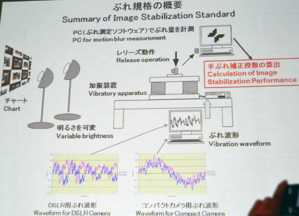 このほか、手ブレ補正効果の表記の統一が明らかにされた。2005年頃からコンパクトデジタルカメラに搭載されだした手ブレ補正機能だが、これまで補正効果の測定法や表記法など、業界内で統一したルールがなく、各社まちまちだった。