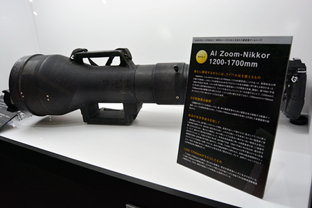 ニコンにとって、今年はニッコールレンズ誕生80周年という節目の年。記念コーナーには最初の「NIKKOR」ブランドのレンズから現行レンズまでを並べて、まさに圧巻の展示だった。なかでも目を引いたのが、1990年当時、世界最長の焦点距離を誇った超望遠レンズ「AI Zoom-Nikkor 1200-1700mm f/5.6-8P IF-ED」だ。