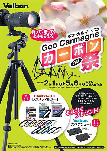 5月6日までのキャンペーン期間中に「Geo Carmagne N/Eシリーズ」のカーボン三脚を購入し、5月15日までに応募したユーザーを対象に、マルミ光機製レンズフィルターまたはベルボンのスペアシューをもれなくプレゼントする。応募用紙はベルボン商品の取扱い店で配布する。