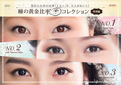「ワンデー アキュビュー ディファイン」は、装用すると白目と黒目のバランスを黄金比率に近づける1日使い捨てコンタクトレンズ。日本人の瞳の白目と黒目の比率は「1:1.5:1」といわれているが、平均より黒目が大きい「1:2:1」に女性の人気が集まることが判明し、「1:2:1」が日本人がかわいい瞳と感じる「瞳の黄金比率」と考えられている。
