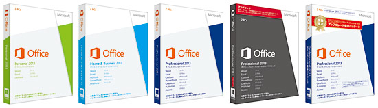 左から「Office Personal 2013」「Office Home and Business 2013」「Office Professional 2013」「Office Professional Academic 2013」「アップグレード優待パッケージ」
