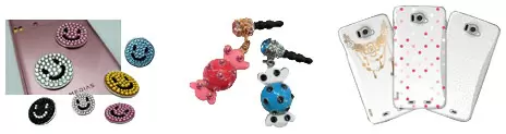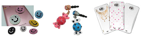 当初販売するスマートフォン用アクセサリ(左から、ジュエリーシール、イヤホンジャックアクセサリ、N-03E用シェルカバー)