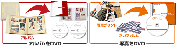「アルバムをDVD」(左)「写真をDVD」のサービスイメージ
