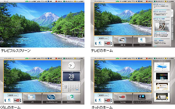 テレビ番組を全画面表示する通常の「テレビフルスクリーン」画面、画面を分割して裏番組などを表示する「テレビのホーム」、天気予報やメモなどを設定できる「くらしのホーム」、インターネットに接続してよく見るサイトを一覧表示する「ネットのホーム」の4種類を用意。ホーム画面に表示するコンテンツを自由に選んでカスタマイズし、家族がそれぞれのホーム画面をもつこともできる。