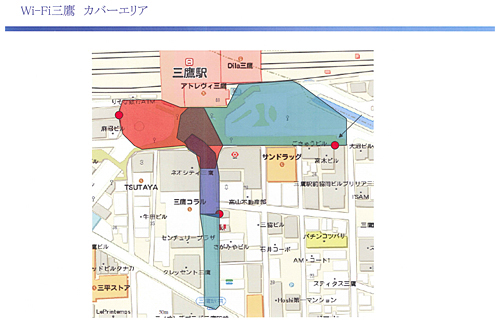 東京都三鷹市の第三セクター、まちづくり三鷹は、三鷹駅南口のバスロータリーと周辺エリアをサービスエリアとした4か所に無線LAN基地局を設置し、無料の公衆無線LANサービス「Wi-Fi三鷹」を開局した。