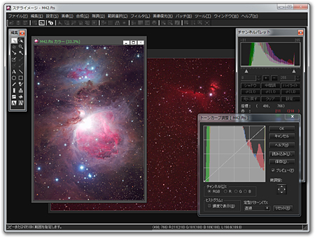 「ステライメージ7」は、天体画像を見やすくするために、黒を基調としたインターフェースに一新。自動位置合わせ高精度コンポジットや、アマチュア天文写真家の上坂浩光氏が考案した「オートストレッチ機能」、チャンネルパレットやガンマフラット補正など、さまざまな新機能を追加して操作性を向上している。