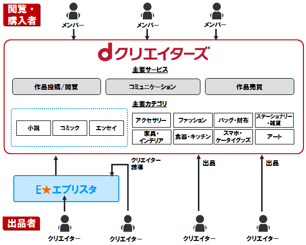 「dクリエイターズ」は、すべての意欲あるクリエイターと、「ほかにはない」「こだわりのある」作品に魅力を感じるユーザーをつなぐ場として提供。ユーザー自身が小説やコミック、エッセイ、イラスト、写真などのコンテンツを創作・投稿し、公開することができUGC(User Generated Content)メディア「E★エブリスタ」で扱っているジャンルのうち、小説・コミック・エッセイの約75万作品が閲覧できるほか、インテリア、文具、アクセサリなどのハンドメイド作品の出品・購入ができる。