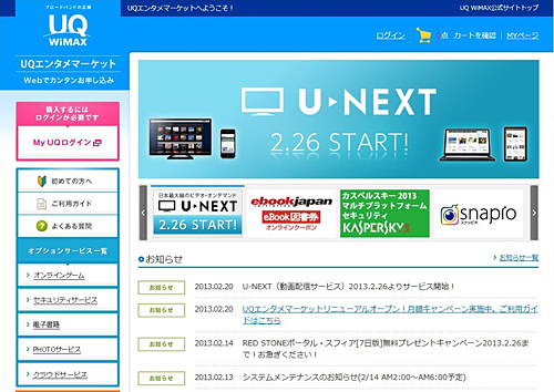 UQコミュニケーションズは、2月20日、昨年12月5日から提供していた「UQオプションストア」の名称を「UQエンタメマーケット」へ変更した。2月26日には、新コンテンツとして定額見放題のVOD(ビデオ・オンデマンド)サービス「U-NEXT」の提供を開始する。