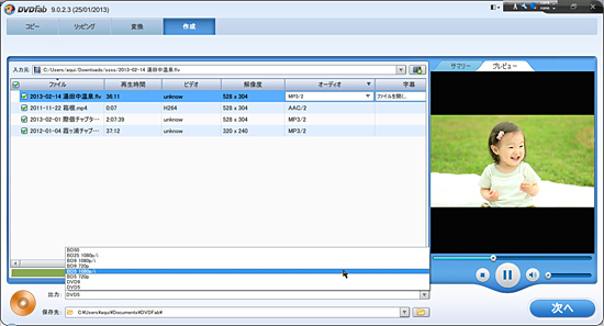 もちろんコピーディスクをつくるオーサリング機能も搭載している。適当な映像ファイルをドラッグ・アンド・ドロップし、任意の出力形式を選択した後、「作成」ボタンを押せば、自動再生に対応する光学ディスクを作成することができる。
