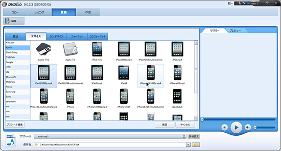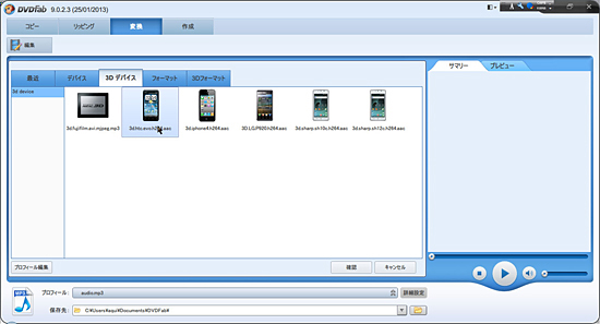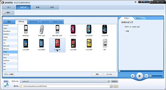 ひと通り「DVDfab3 BD&DVDコピープレミアム」を試したが、スマートフォンやタブレット端末など、再生機器に合わせた豊富なプリセットを用意し、わずらわしい設定なしに最適な動画や音声に変換できることが、一番の魅力だと感じた。ひと言でスマートフォンといっても、最適なファイル形式・サイズは、機種によって違う。コンテンツファイルの変換作業に慣れた人なら、最適なビットレートやフレームレート、解像度の設定ができるかもしれないが、一般の人には至難の業だろう。