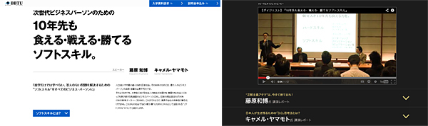 ビジネス・ブレークスルー大学は、オンラインで経営の学士を取得できる日本初の大学。映像・特設コンテンツ『次世代ビジネスパーソンのための10年先も食える・戦える・勝てるソフトスキル』(http://bbt.ac/softskills/)は、若手ビジネスパーソン向けに2月8日に開催した公開フォーラムの模様を中心に構成。社会現象化している“10年後のしごと”文脈をもとに、10年後のビジネス環境とコミュニケーション、文化理解、リーダーシップなど、答えのない複雑な問題を解決するためのスキル「ソフトスキル」にフォーカスした。