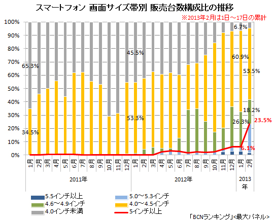 スマートフォンとしては最大サイズの5.5インチを含む「5インチ以上」は、2012年10月までは4%未満に過ぎなかったが、11月は4.1%、12月は6.4%、2013年1月は6.1%と、11月以降、増加している。さらに2月は「Xperia Z SO-02E」が加わり、一気に2割以上に拡大する見込みだ。「5インチ以上」は、2月1~17日の累計ですでに「4.6~4.9インチ」を抜いて2番手に躍り出ており、「Xperia Z SO-02E」の売れ行き次第では、もっと高まるかもしれない。