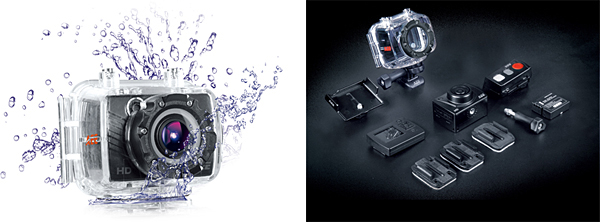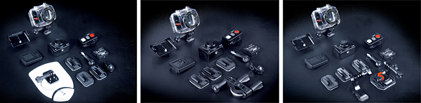 シーンに合わせて、「スタンダード」「サーフィン」「モーターサイクル」「ヘルメット」の四つのパッケージをラインアップ。各パッケージに、水中撮影用の60m防水ケースや、強力なシールつきのアタッチメント、約15m離れた場所からでも操作できるリモコンが付属する。