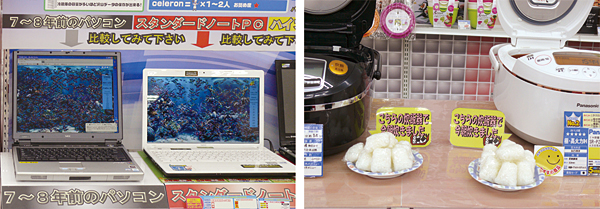 エディオン広島本店ではパソコンコーナーで新旧モデルの差がわかるデモを、炊飯器コーナーでは試食を実施