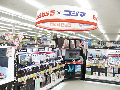 コジマNEW広島インター緑井店は、リニューアルでビックカメラとコラボレーションしたデジタルカメラのコーナーを設置