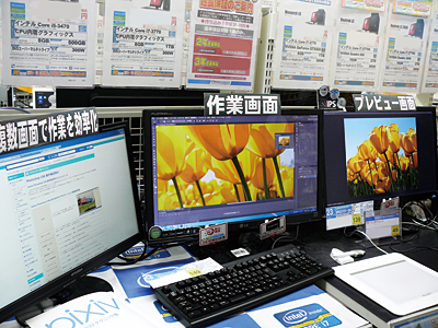 一方、家電量販店よりも売り場面積が狭いパソコン専門店では、主力のパソコンに絞って家電量販店と対抗。ドスパラ広島店では、自社ブランドパソコン「ガレリア」で、メーカー製品に負けない性能と価格をアピール。原店長代理は、「『ガレリア』の性能を理解していただくための展示に力を入れている」という。例えばオンラインゲームの体験コーナーでスムーズにゲームが楽しめることを訴えたり、複数の画面で画像編集ソフト「Photoshop」で作業を効率化したりするデモを行っている。