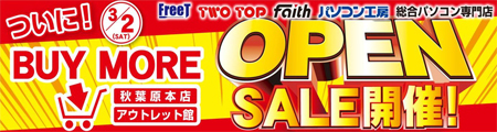 「BUY MORE 秋葉原本店」は、これまで以上に顧客の用途に合わせたPC、周辺機器、パーツを揃え、各ブランドの人気商品や、より専門性の高いPCを販売。「BUY MORE アウトレット館」は、「マウスコンピュータ」「パソコン工房」「Faith」「TWOTOP」のアウトレットPCをはじめ、タブレット端末やスマートフォンをアウトレット価格で販売する。また、PC、PCパーツ、家電、デジタル機器、スマートフォンなどの各種中古商品の販売・買い取り、下取りを行う。オープンを記念して、3月2日、秋葉原本店とアウトレット館で大特価セールを開催する。