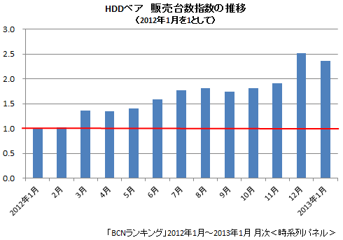 HDD市場は、HDDの主要生産国の一つ、タイを襲った11年の大洪水以降、品薄状態が続き、価格が高騰したが、12年に入って品薄が解消され始めた。家電量販店の実売データを集計した「BCNランキング」で、12年1月の販売台数を1としてみた月ごとの販売台数指数は、右肩上がりで推移。6月は1.59、7月は1.77と順調に市場が回復している。