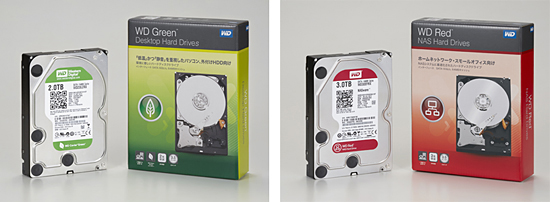 左が外付けHDD向けの「WD GREEN」、右がNAS向けの「WD RED」