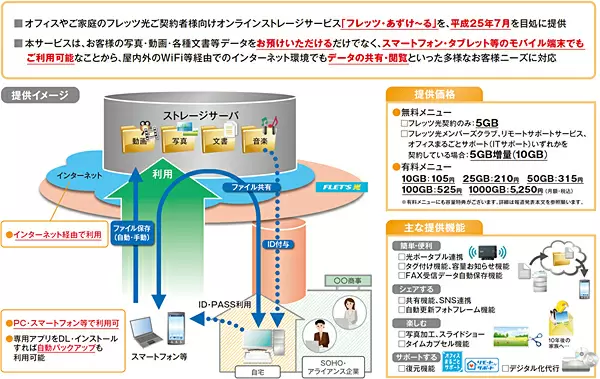 NTT東日本は、光ファイバー接続サービス「フレッツ光」の契約者を対象に、多機能オンラインストレージサービス「フレッツ・あずけ~る」を、7月をめどに提供する。「フレッツ光」契約者なら5GBまで無料で利用でき、月額105円~の有料メニューの提供も予定している。