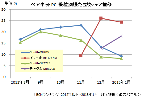 停滞が続いていたベアキットPC市場が、いま活気づいている。起爆剤は、新規参入したインテルが2012年11月下旬に発売した「DC3217IYE」だ。ベアキットPCの月間機種別ランキングで昨年12月、今年1月と2か月連続で1位を獲得。新興勢力によって、市場は活性化しつつある。
