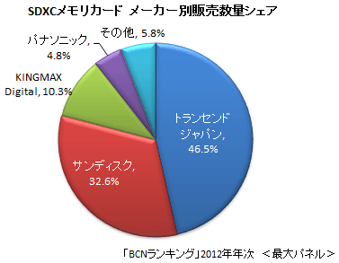 このSDXC規格のメモリカード市場で、2012年のメーカー別販売数量シェア46.5%という圧倒的な数字で1位を獲得したのがトランセンドだ。このNo.1メーカーのトランセンドが、高速BusスピードUHS-I規格に対応したSDXCメモリカード「TS64GSDXC10U1」を2月に発売した。今回は「TS64GSDXC10U1」の高い高速性能を、Class10のみ対応のSDXCカードと比較した。